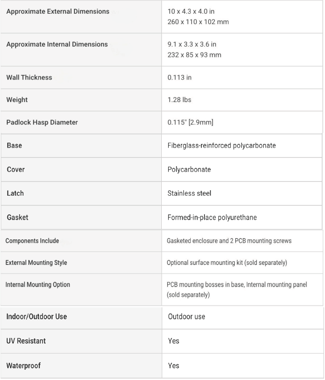 Podstawa ma 16 wygodnych bossów montażowych, umożliwiając łatwą i bezpieczną instalację płytki drukowanej lub innych urządzeń. Niezależnie od tego, czy jest używany w pomieszczeniu, czy na zewnątrz, ta blokna obudowa oferuje niezawodną ochronę krytycznych komponentów elektrycznych i elektronicznych.