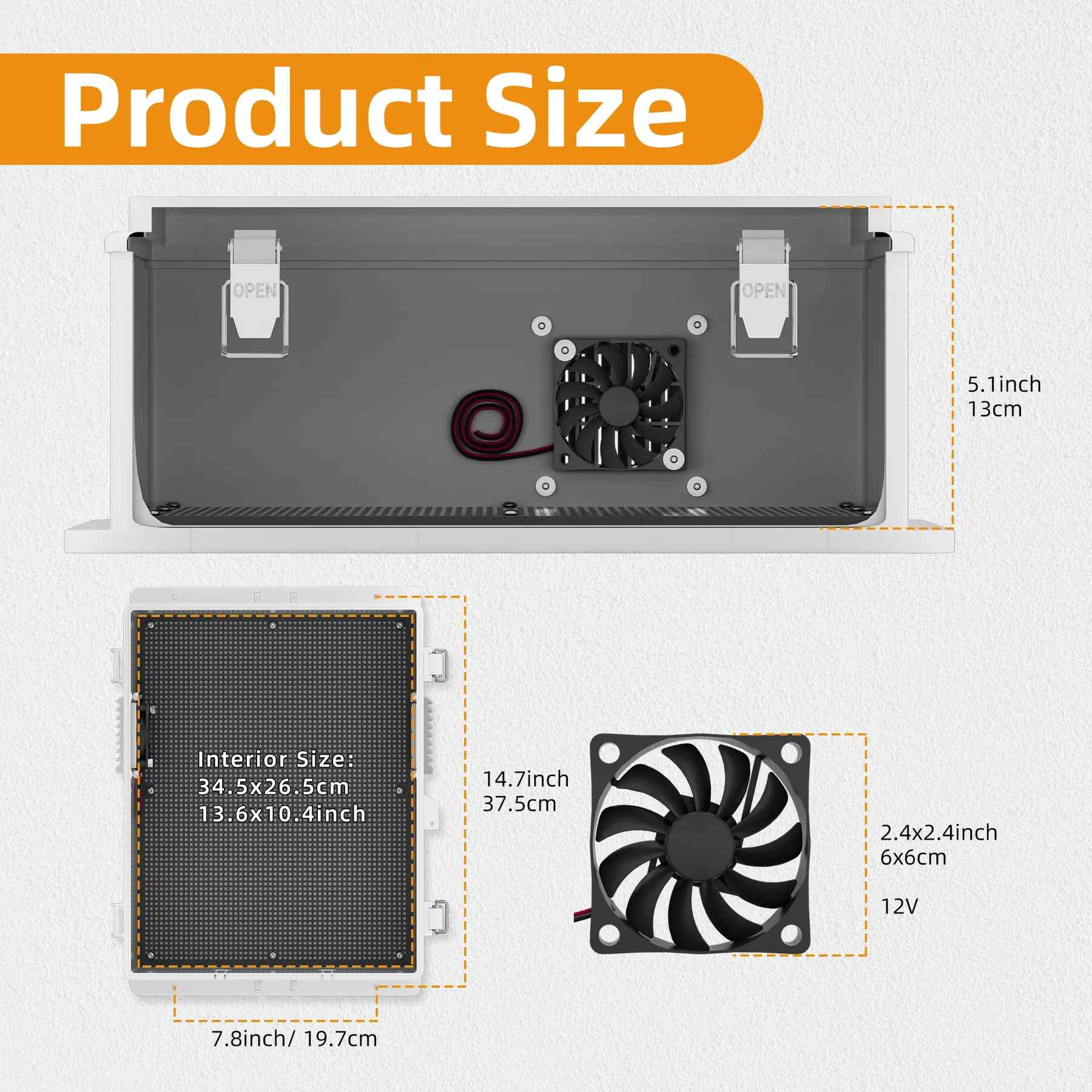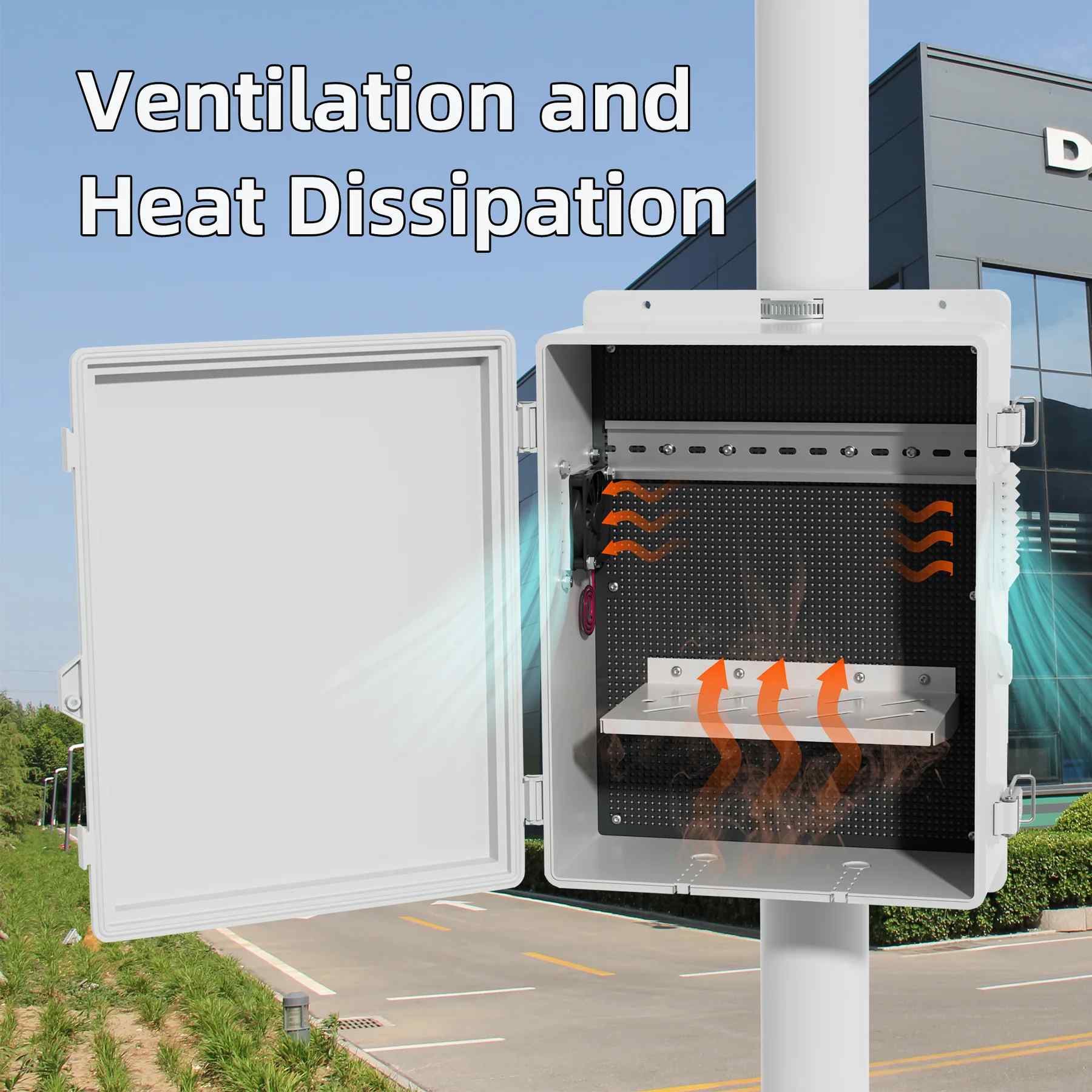 【Najwyższa wentylacja dla optymalnej wydajności】- To elektryczne obudowę ma wbudowany wentylator 12V i wentylowane panele boczne w celu promowania cyrkulacji powietrza i rozpraszania ciepła, jak pokazano na obrazach z otwartą obudową i strzałkami przepływu powietrza. Zintegrowany system wentylacji pomaga zapobiegać przegrzaniu wrażliwych elementów elektronicznych wewnątrz pudełka.
