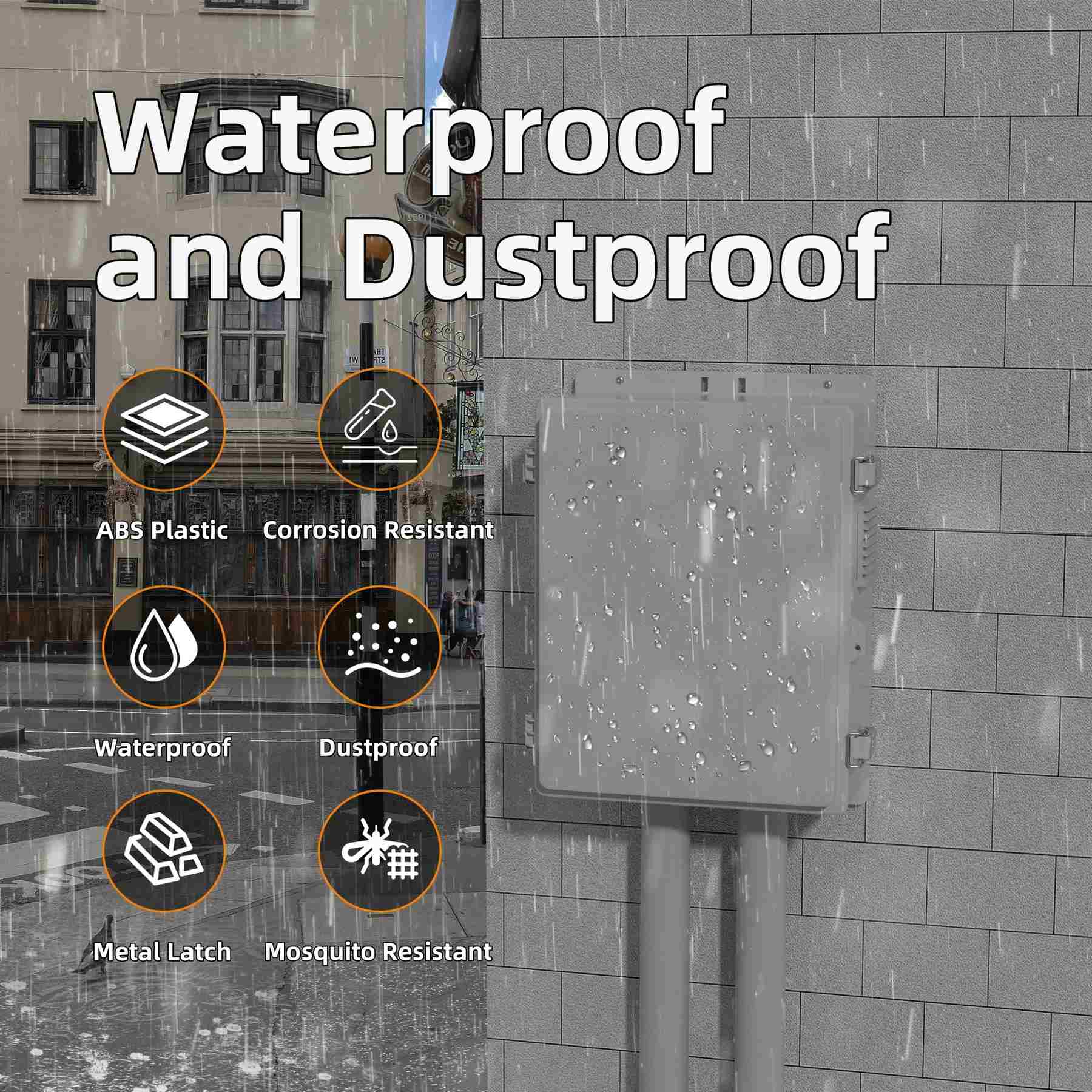 【Trwała, odporna na warunki atmosferyczne i bezpieczna konstrukcja】- Pudełko jest wytwarzane z ciężkiego plastiku ABS, dzięki czemu jest odporna na korozję i odporność na uszkodzenia UV, jak wskazują ikony, które pokazują, że jest wodoodporna, odporna na korozję, odporność na komar i ma metalowy zatrzask. Obudowa jest również wodoodporna IP65 i odporna na kurz i ma bezpieczne metalowe zatrzaski.